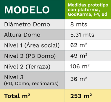 En una extensión de 253 m2 de construcción, cada domo consta de 3 niveles: